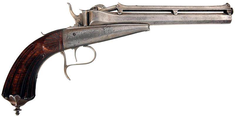 19世纪中叶诞生的科莱特重力手枪,是无壳弹与连发供弹两种当时最新枪械技术相结合的一次大胆尝试 “火箭枪弹”的出现和发展 19世纪中叶,正是枪械史上最重要的两大进步——定装枪弹和机械式连发枪出现的关键时期。来自不同国家的发明家们,不约而同地推进着各自的研发工作,有些成果甚至几乎同时出现。例如在定装枪弹领域,虽然卡齐米尔·勒福舍在1836年已经开发出使用金属弹壳的针发枪弹,但基于其他路线的试验和开