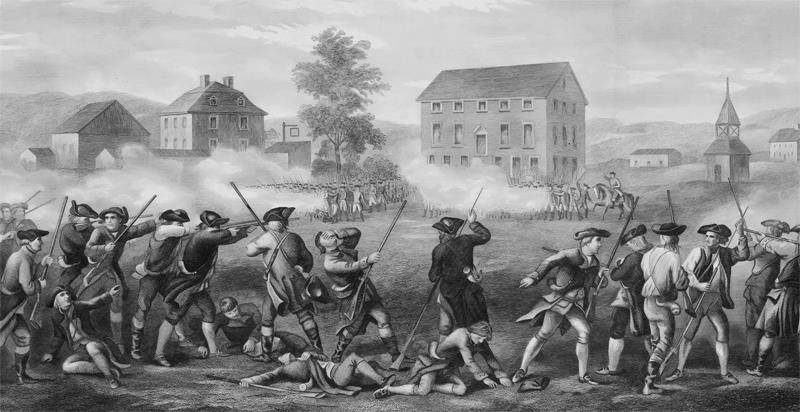 反映列克星敦绿地之战的早期版画,画面中英军官兵正在进行齐射,民兵出现伤亡,个别人正在进行反击。画面右侧的尖顶建筑是镇会议所,平时兼作教堂和存放弹药的仓库 马萨诸塞民兵手中的进口和国产长枪(续) 英国燧发枪 马萨诸塞殖民地一向鼓励其民兵自备枪支,而不是依赖政府供应。这一做法在和平时期是可行的,但一旦爆发大规模战争,就会面临枪支短缺的问题。因此,在法国- 印第安战争期间,马萨诸塞当局不得不向英国