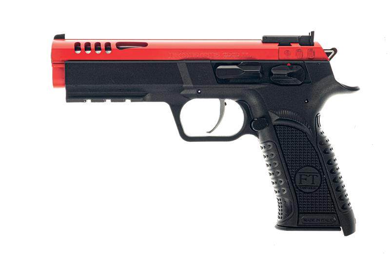 意大利Tanfoglio公司近期推出的FORCE 22L半自动手枪发射.22 LR弹,主要面向射击训练和射击娱乐市场。因发射的.22 LR弹威力较低,该枪并未采用手枪常用的枪管短后坐式自动方式,而是自由枪机式自动方式,射击过程中枪管保持不动,有利于提高射击精度。其套筒由铝合金制成,表面涂装为鲜红色,以提醒用户。套筒前部左右两侧加工有多个减重、散热孔,固定式准星为刀片状,缺口式照门可调左右及高低