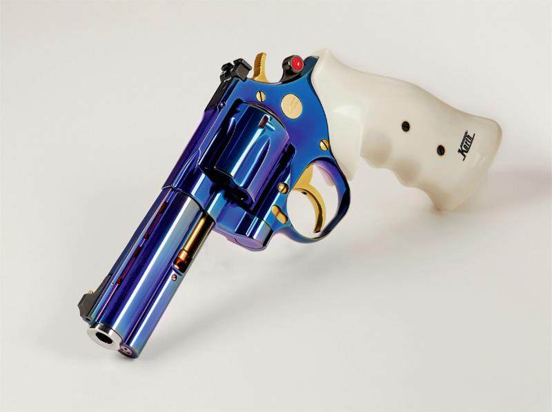 Korth Classic蓝色版转轮手枪是Korth公司面向收藏市场推出的产品。其枪管套、转轮座及弹巢外表均涂装为蓝色,给人以幽深的感觉,再配以金黄色的弹巢固定杆、扳机、击锤及乳白色的握把,辨识度极高。其准星为刀片状,可调式照门为缺口式,准星后部设有金黄色的铜柱,方便瞄准。握把前部设有指槽,握把后部为变化的弧线形,与手掌的结构相吻合,握持时较贴手。其弹巢锁定杆并非像常规转轮手枪那样设在转轮座左