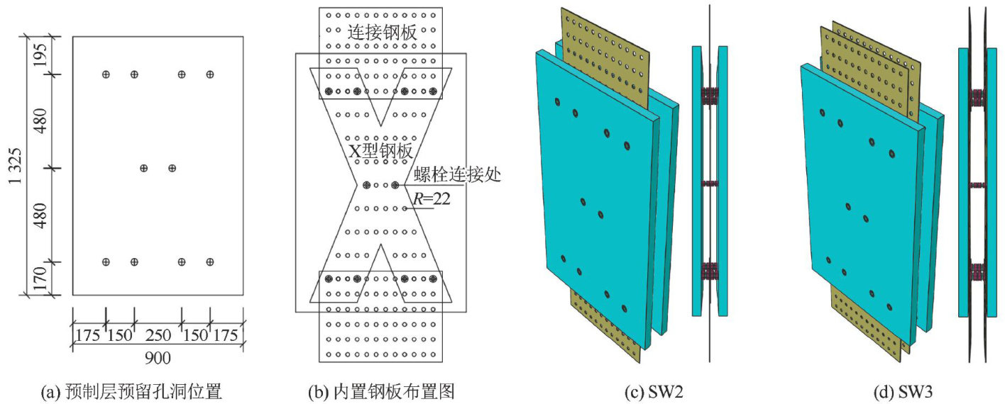 摘要:为了从构造上进一步提升预制叠合剪力墙的连接性能,改善传统叠合剪力墙的施工质量和抗震性能,提出一种板间内置钢板加强的新型叠合剪力墙。在验证有限元建模方法合理性的基础上,对传统双面叠合剪力墙SW1与板间内置钢板加强的双面叠合剪力墙SW2、SW3进行推覆力模拟分析;基于模拟结果,对比分析各剪力墙的推覆曲线和位移延性,探讨不同构造形式对剪力墙抗震性能的影响;随后,选取SW2进行不同参数下的模拟分析。研究结果表明:(1)新型叠合剪力墙相较于传统设计,在承载能力上实现了显著提升,其中,SW3因其独特的钢板暗支撑布置形式,在增强承载力方面效果尤为突出,相较于SW1的承载能力提升了约 19% ;(2)两种新型叠合剪力墙在位移延性上表现相近,表明在保持墙体内含钢量一致的情况下,改变钢板的布置形式并不能提升墙体的变形能力;(3)当轴压比和含钢量在特定范围内增加时,虽然有助于提升新型叠合墙体的承载能力,但会相应地降低其延性。