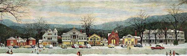 《三重自画像》,诺曼·洛克威尔于1960年创作。 我们的伯克夏旅程,起点是斯多克布里奇镇的诺曼·洛克威尔博物馆。诺曼·洛克威尔(Norman Rockwell, 1894—1978)是美国20世纪中期的“首席艺术家”,他的作品展现着小镇生活、家庭价值观和公民乐观主义,是“美式风情”的代名词。近50年的时间里,他为《星期六晚邮报》(The Saturday Evening Post)创作了32