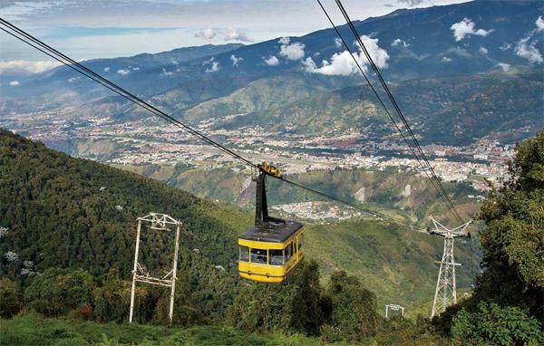 梅里达的穆昆巴里缆车像是一部豪华电梯,可通往委内瑞拉最高的山脉。每个车厢可容纳60人,整个行程需要50分钟。 委内瑞拉在南美洲的位置。梅里达在委内瑞拉的位置 飞机降落在埃尔·维希亚(El Vigía)机场的那一刻,热浪几乎是扑面而来,潮湿、黏腻的空气让人迫不及待地想要逃离。汽车沿着查马河(Río Chama)蜿蜒而上,随着海拔的爬升,窗外的植被从阔叶芭蕉变成了针叶松林,空气中的水分似乎被某种巨