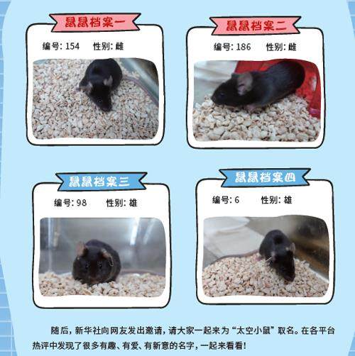 新华社发布 “飞天小鼠”取名排行榜!快来看看有你取的名字吗? 2025年10月31日,4只小鼠随神舟二十一号载人飞船飞赴太空,揭开我国首次哺乳动物空间科学实验的神秘面纱。它们的编号分别是——154、186、98、6。