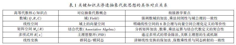 摘 要:针对传统“高等代数”教学存在的侧重计算技巧灌输、弱化代数结构解读的突出问题,本文提出以“抽象代数”思想为主线重构课程内容的教学改革方案。通过深度剖析线性空间等核心对象的代数结构,结合矩阵空间、多项式环等实例搭建认知桥梁,构建实例具象化、结构抽象化、性质体系化的阶梯式教学路径,着力揭示数学对象背后的统一规律与本质联系。本文强调以抽象代数的数学观为指导,引导学生在具体与抽象之间建立桥梁,这样不