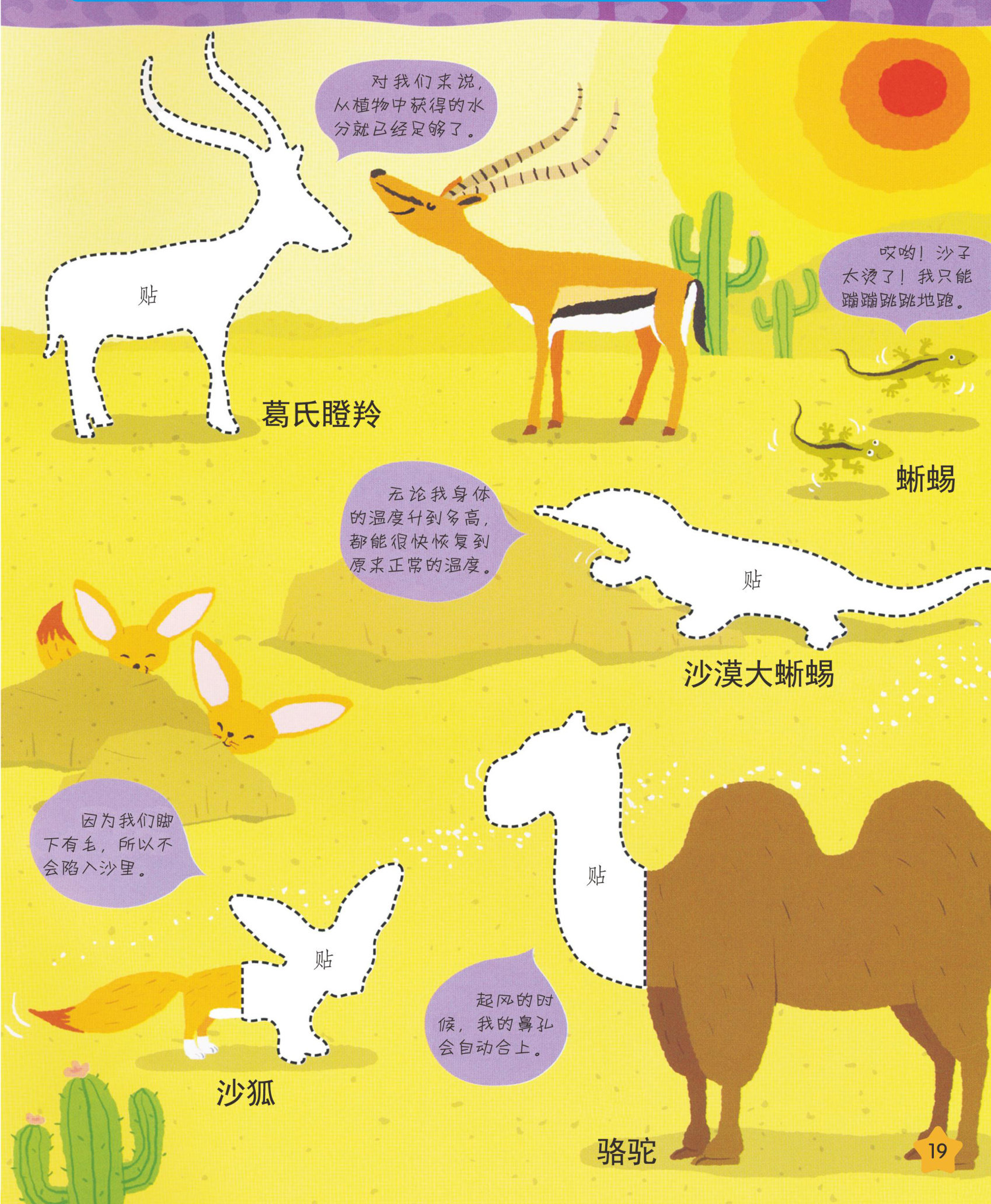 沙漠中,阳光火辣辣的,还刮着风沙动物们白天藏身在沙子里,晚上才活动 猫鼬(you)是沙漠中的守望者。它常两腿站立,让阳光照在胸部和腹部上。 沙狐的耳朵非常大,可以很快地散热。 骆驼不喝水也能活17天 为了躲避炎热,沙蛇一般藏在沙子里 一天中最炎热的时候蝎子待在洞穴里,到太阳落山的时候才会爬出来。 请找到动物贴纸贴好,然后说一说:沙漠中有哪些动物?哪些动物会躲在沙子里?