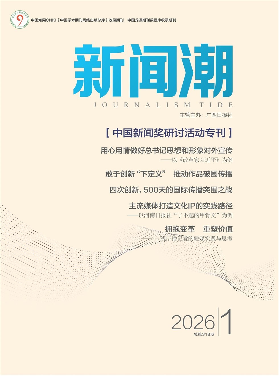 《新闻潮》杂志 Journalism Tide 主管单位、主办单位:广西新闻学会,广西新闻工作者协会 新闻业务刊物。针对新闻界的思想动向与新鲜事物发表意见,介绍新闻业务知识,交流实践经验,研究新闻史料,介绍中外名记者、名编辑等专业人员的成才之路,介绍国内外新闻理论、采访经验及新闻界动态。