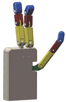 摘要:【目的】针对传统按摩机械手适用场景受限、手法单一、结构刚性大且自适应性差的缺陷,设计了一种兼具大包络范围、多按摩姿态的高适应性3指按摩机械手,以满足中医按摩的平稳性、力度及安全性要求。【方法】采用欠驱动腱绳传动与差动滑轮机构,结合按人手关节耦合比例设计的扭簧结构,设计了机械手本体;通过改进D-H法建立运动学模型,利用Matlab软件分析了工作空间,借助Adams软件仿真验证了适应性与按摩性能。【结果】结果表明,机械手食指、中指的最大活动范围约 200mm ,拇指的约 150mm ,可实现指揉、捏拿等手法;按摩力稳定在 23~33N ,运动平稳、无刚性冲击;该机械手的自适应性与稳定性优于传统连杆传动机构,符合中医按摩需求。