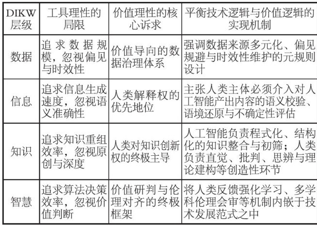 【摘要】文章以工具理性与价值理性理论为核心视角,结合马克思异化劳动理论、“数据—信息一知识一智慧”(DIKW)理论框架等,系统梳理生成式人工智能嵌入知识生产的理论基础、实践样态与现实困境。研究发现,生成式人工智能虽能显著提升知识生产效率,但在工具理性效率优先逻辑主导下,引发知识质量侵蚀、主体能动性消解与价值伦理冲击三重困境。生成式人工智能嵌入知识生产的过程呈现出技术逻辑与价值逻辑的辩证张力。为超越工具理性局限,需从理念转型、机制创新、实践探索三个维度推进相关工作,构建人机协同、价值共创、生态共享的知识生产新生态。