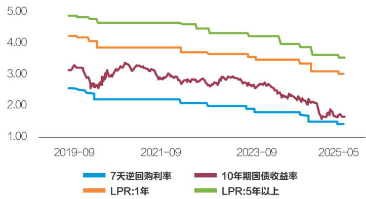 本文回顾了低利率背景下,我国商业银行业绩表现承压但股价屡创新高的相悖现象,提出了用策略思维框架来理解审视商业银行估值修复的底层逻辑,并进一步展望了本轮商业银行估值修复进程的可持续性。 低利率时代:净息差持续收窄导致业绩表现承压 2019年以来,我国的利率水平整体下行,存贷非对称降息导致息差持续收窄。截至2025年6月30日,我国1年、5年期LPR分别为 3.00% 、 3.50% ,较20
