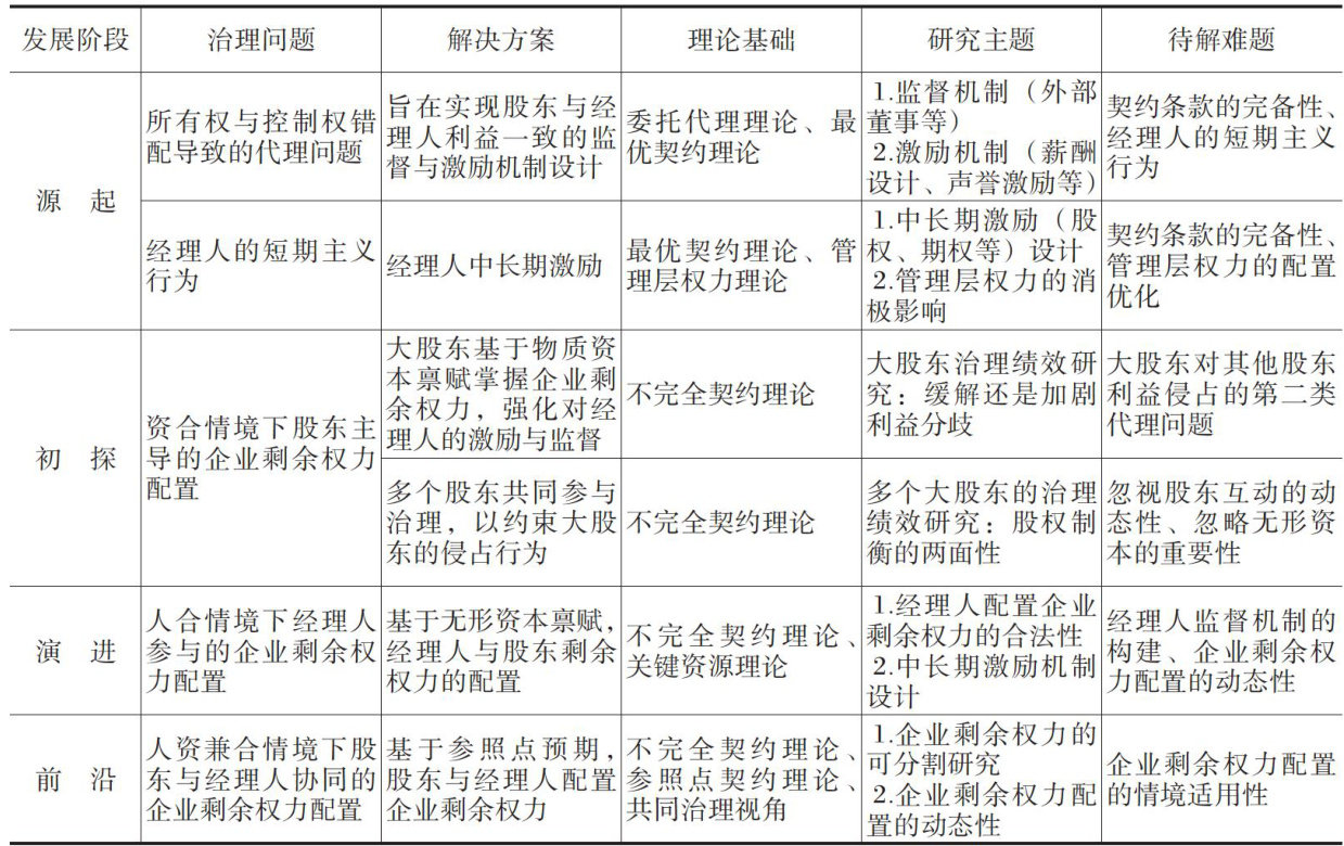 摘要:“完善中国特色现代企业制度,弘扬企业家精神”需要优化出资人与企业家的企业剩余权力配置,以提高公司治理效率和推动高质量发展。本文研究认为,企业剩余权力配置是为了应对源于所有权与控制权分离产生的代理问题,从而提高公司治理效率,其依次经历了资合情境下股东主导的企业剩余权力配置、人合情境下经理人参与的企业剩余权力配置和人资兼合情境下经理人与股东协同的企业剩余权力配置三个发展阶段。在中国治理情境下优化企业剩余权力配置,可围绕拓展企业剩余权力配置主体、优化企业剩余权力配置依据和提高企业剩余权力配置效率等展开,以期拓展企业剩余权力配置研究的理论边界,同时为完善中国特色现代企业制度和弘扬企业家精神提供理论支持。