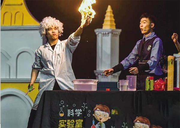 1月10日晚,新疆乌鲁木齐市,沉浸式儿童剧——互动科学秀《疯狂实验室》在新疆人民剧场演出。图为掌中火焰展示。 刘新摄